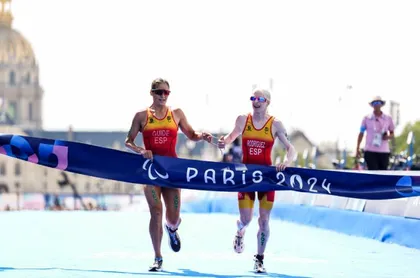 La triatleta invidente Susana Rodríguez, guiada por Sara Pérez, ganó el oro en triatlón en los Juegos Paralímpicos de París. Foto: Comité Paralímpico Español.